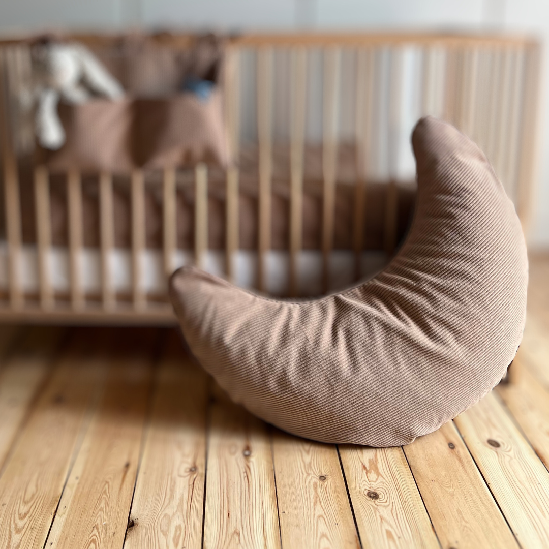 Ønsker du at skabe helhed på børneværelset, så er vores Månepude en skøn og blød tilføjelse til indretningen. Puden er udelukkende lavet i naturlige materialer såsom bomuld og kapok, og derfor er den også helt ideel som hovedpude, og ammepude eller bare til at give et kæmpe kram.