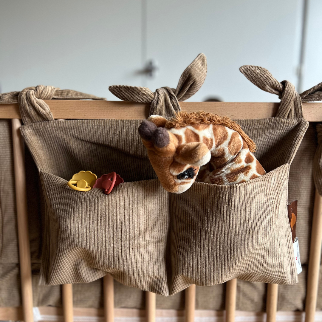 Vi tilføjer en ny, blød opbevaringsløsning i matchende fløjl til tremmesengen, så nusseklud, sutter og så videre er lige inden for rækkevidde, selv i de mørke nattetimer. Lommen bindes fast til sengen og fuldender det luksuriøse og matchende sovemiljø.